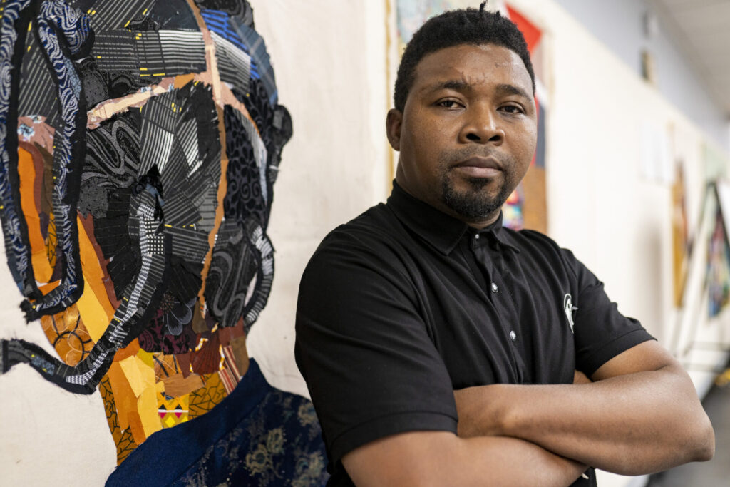 Uzoma Samuel, an artist from Lagos, Nigeria, was visiting the US and leading a portrait quilt class during our visit to the Bay Area. Despite the deep roots of fabric in West African culture, Uzoma encountered similar challenges of art versus craft distinctions faced in the US, as galleries often regarded his work as craft rather than art. Seeking a supportive community, Uzoma reached out to Sara Trail and joined SJSA at QuiltCon 2023 in Atlanta, marking his first entry into a quilt show and his first visit to the US. Uzoma and SJSA view their collaboration as an exchange of skills and knowledge, sharing stories and techniques to refine their practices and enhance their work.