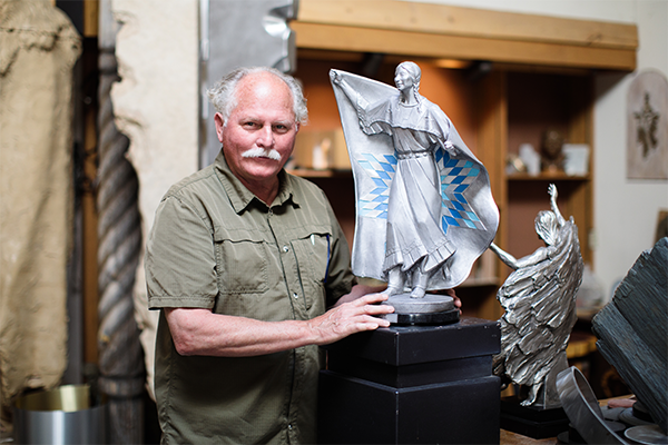 Sculptor Dale Lamphere isn’t a quilter, but he’s made one of the country’s most visible quilts. Composed of 128 stainless steel diamonds, the traditional Lakota Star quilt unfurls from the back of a 50-foot-high, 12-ton sculpture of a Native American woman outside of Chamberlain. Read about how Dale constructed one of South Dakota’s most famous landmarks, Dignity of Earth and Sky, with the help of engineers, auto experts, and yes, quilters in Quiltfolk, Issue 24: South Dakota.