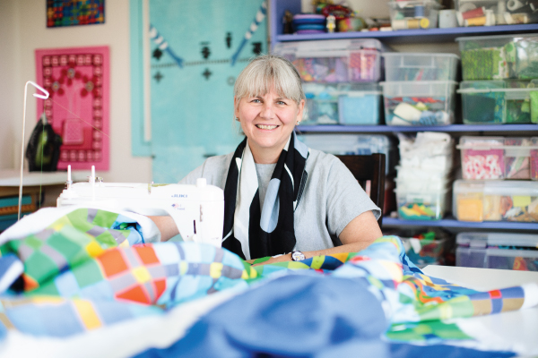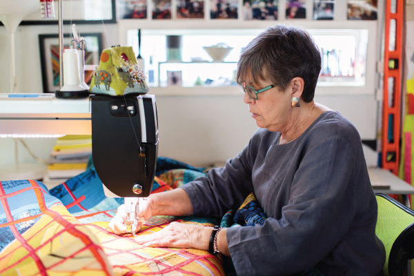 Kathy York has found inspiration from many sources over the years as her art has grown. Though her quilts are more abstract, they always have meaning to her. Personal stories are woven into a mix of bright colors and neutrals. Today, she leans more into modern quilts and enjoys the repetitive act of quilting because it allows her to think deeply about what she’s making.