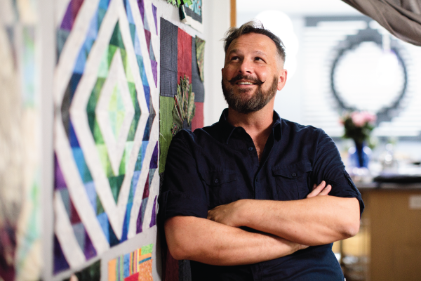 Steve Schmid, a former high school theater teacher, currently makes costumes for opera and theater companies. While fabric and sewing machines have been tools of the trade for much of his professional life, gaining confidence as a quilter has been trickier than he expected. The themed challenges and classes put on by his local guild have been the most helpful, and he has applied his new skills to making numerous quilts for his three children. He is also interested in quilt history and serves as the vice president of Idaho’s Quilt Heritage Museum’s board of directors.