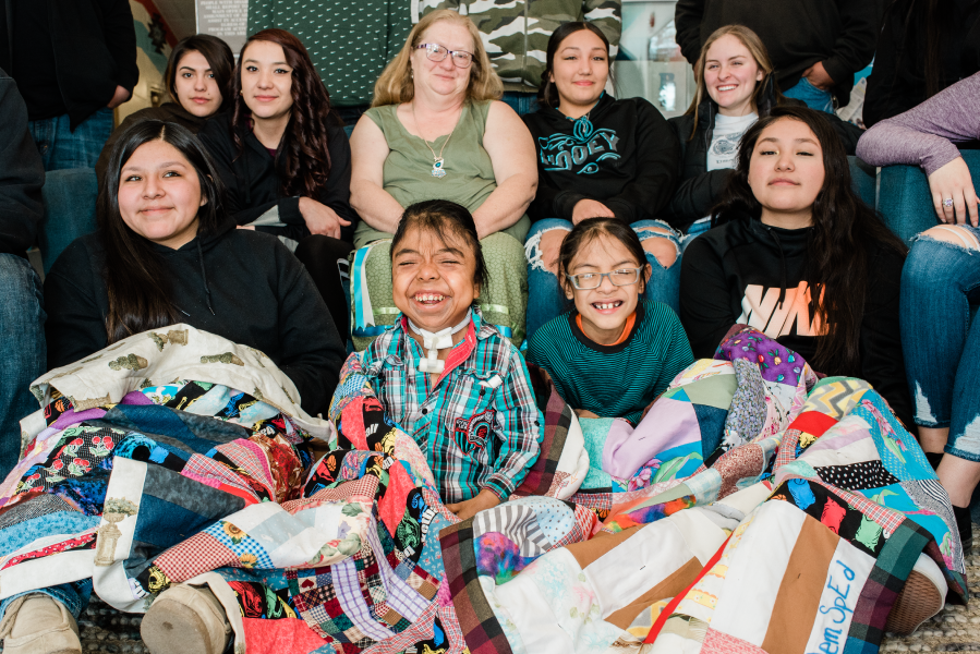 High school students on the Duck Valley Reservation in northern Nevada engaged in a memorable project this year: They made quilts for two special needs kids in their community. Led by their generous and caring teacher, Pamela Reed, the students, most of them members of the Shoshone-Paiute Tribe, learned to sew. Quiltfolk spent many hours at the school getting a story as unique and beautiful as each of Ms. Reed’s special students.