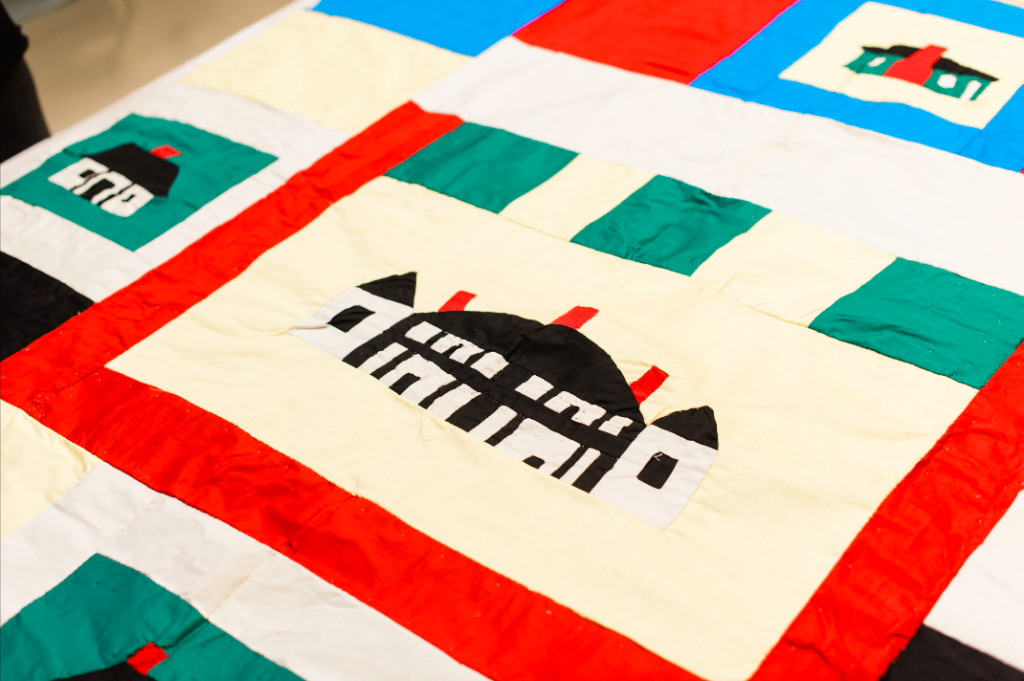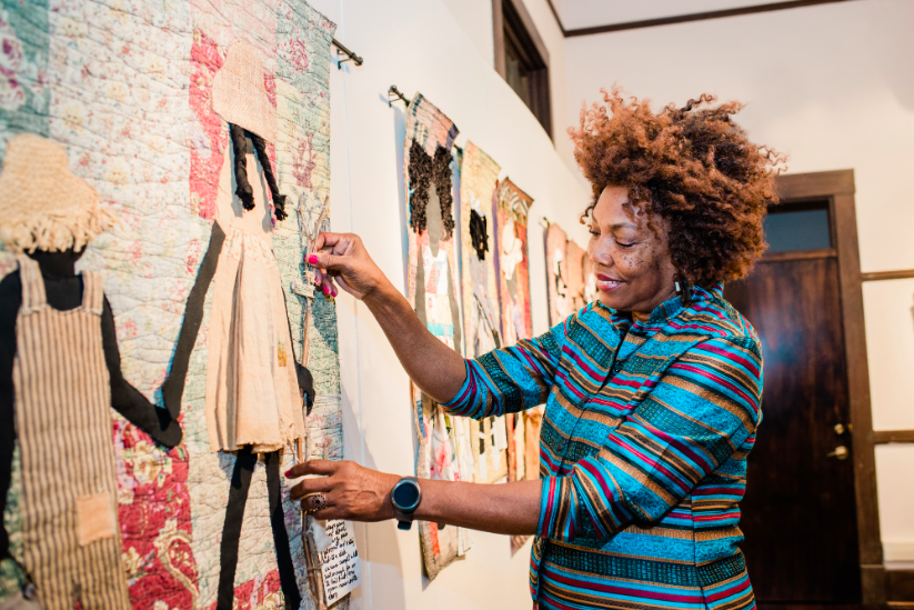 It was clear who the woman of the hour was at the Black Heritage Gallery. Judith Braggs exudes a timelessness that is echoed in her art. Made to be displayed on the wall, her work features scenes of home, family, and history “painted” with curated bits and pieces of fabric.