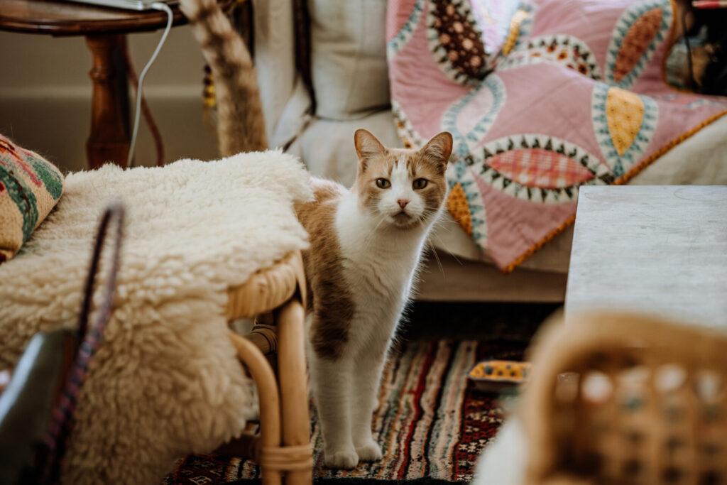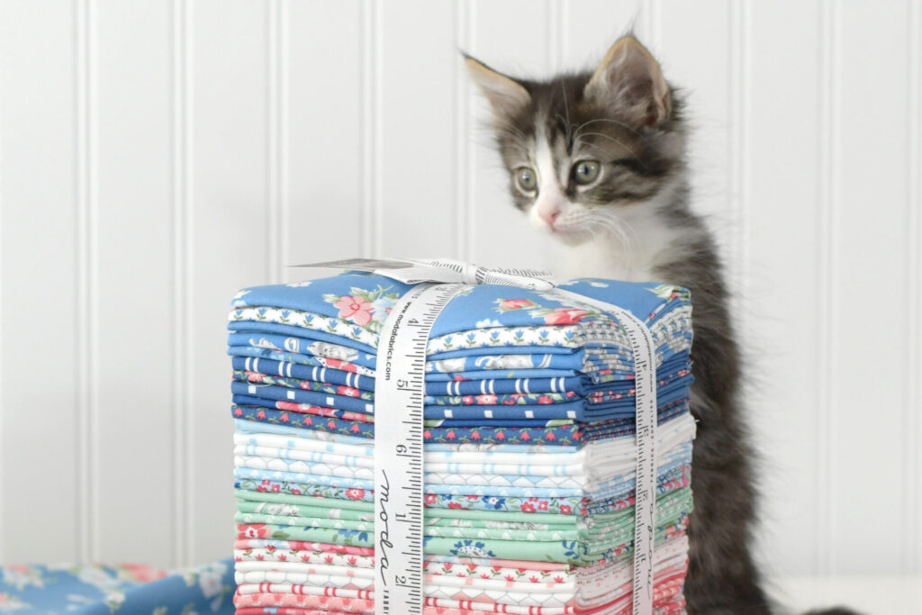 In July 2024, Camille Roskelley let the cat out of the bag: Georgie, a gray and white kitten, had become a “foster fail” after her family fell deeply in love with the cuddly boy. Now in his furever home, Georgie joined brown tabby cats Cosmo and Stitch. Camille, a quilter who owns a pattern and fabric design company, Thimble Blossoms, continues to foster kittens—something she started doing after being inspired by the foster family from whom she adopted Cosmo. Las Vegas, Nevada, where Camille lives, can be a tough place for a feral cat, and she uses her company’s Instagram account to advocate for fostering, as well as spaying and neutering animals.