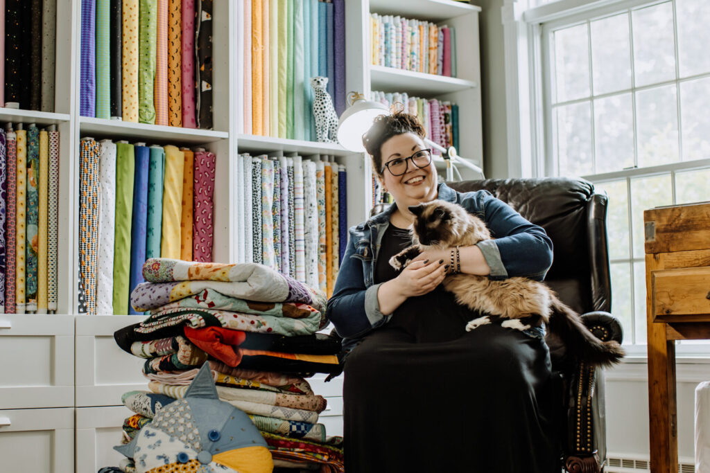 Between her cat-inspired pattern book, Purr-fect Patchwork, and her popular fabric collection, “Kitty Litter,” it’s safe to say Pamela Jane Morgan thrives in the middle of the Venn diagram where cat lovers meet quilters. Meet her three feline muses, and learn more about Pamela’s swerving path to quilting.