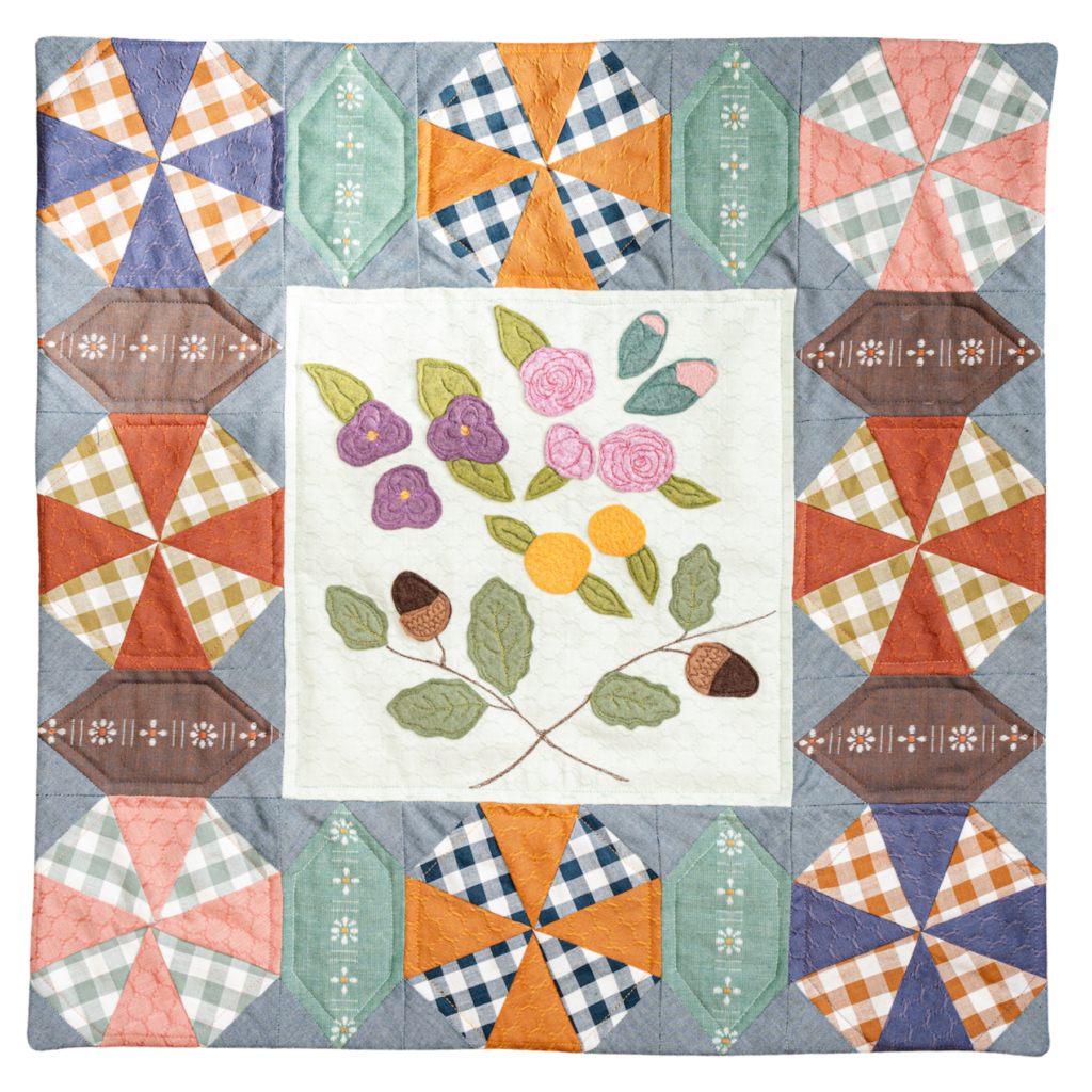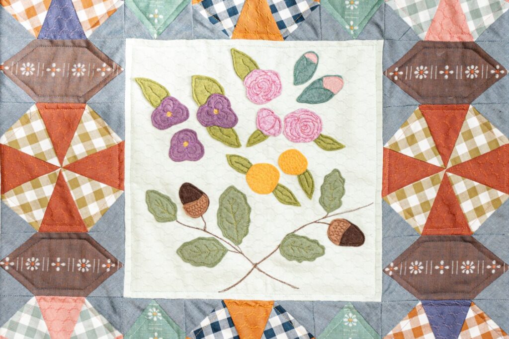 In the center, they have focused on charming elements from nature, including acorns, flowers, and leaves to channel Beatrix’s love of the English countryside. You could work with pretty wool felts and free motion stitching, choose hand embroidery to embrace a slower process, or even combine the two. For the pieced blocks, ginghams and honeycomb patterns swirl to add movement and, as always, there is plenty of scope to add your own personality through fabric choices and embellishment.